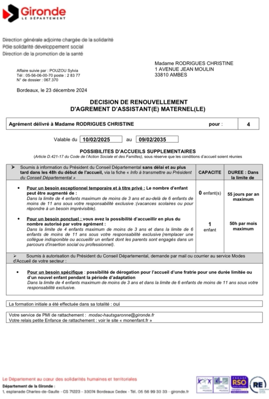 Assistante maternelle depuis 11 ans, mes valeurs de bienveillance, patience et empathie, ainsi que mon engagement pour un environnement de co-éducation respectueux du rythme de chaque enfant, sont au cœur de mon approche.