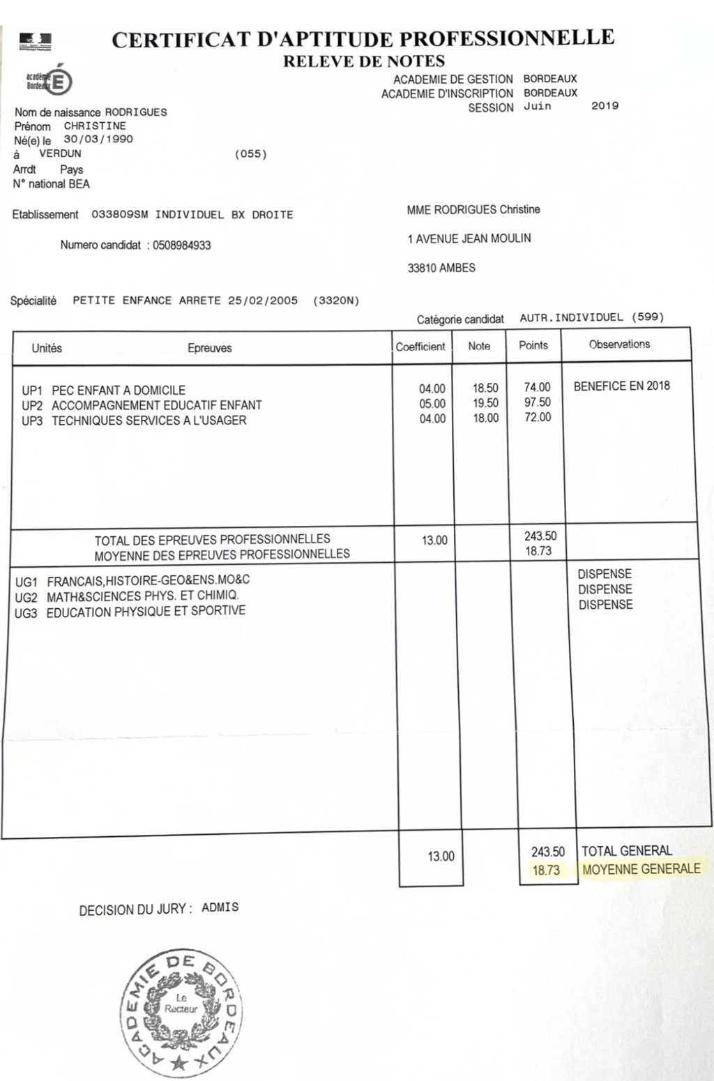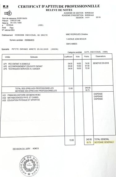J’ai un CAP Accompagnant Éducatif Petite Enfance et je suis en cours de validation de mes compétences pour obtenir mon Diplôme d’État d’Auxiliaire de Puériculture.