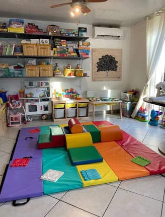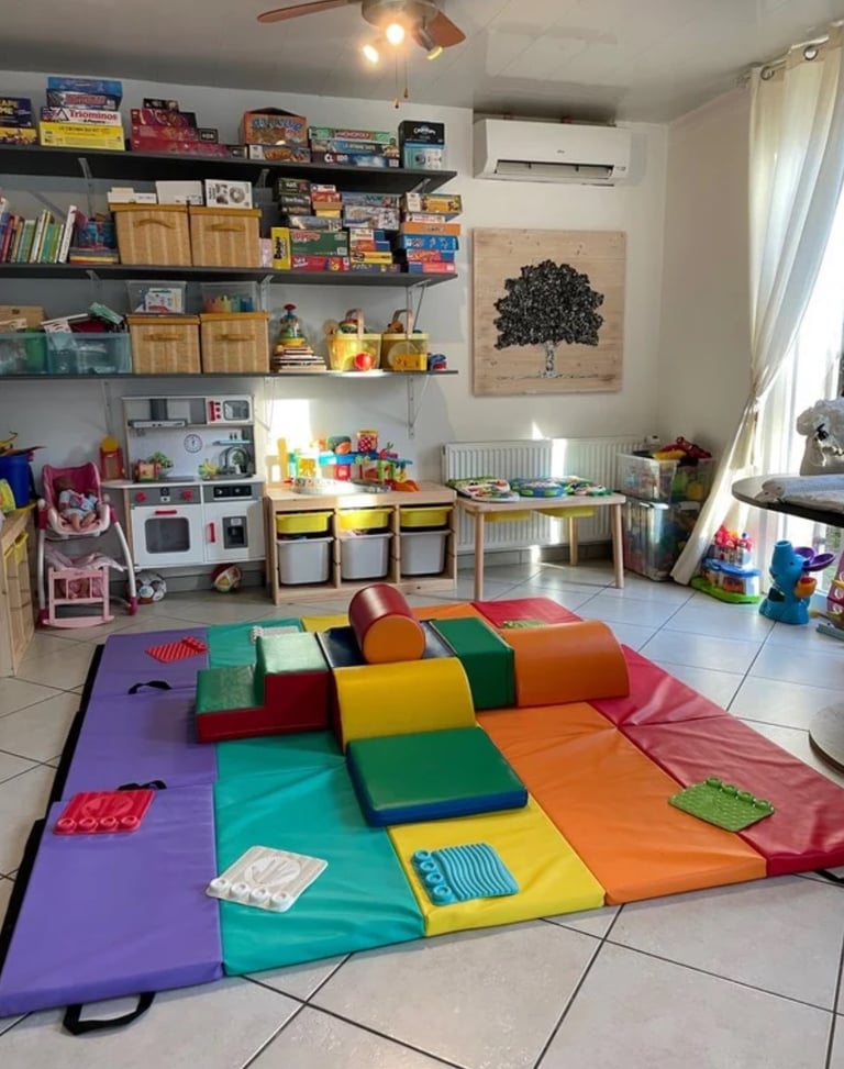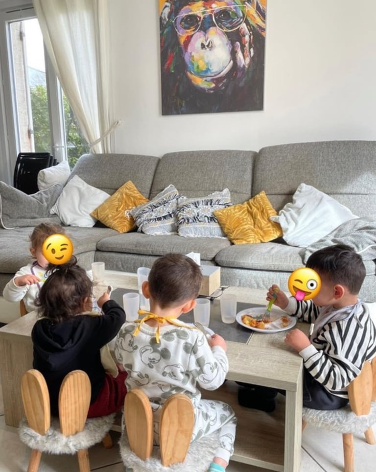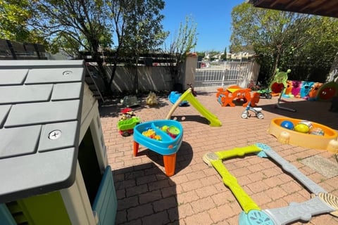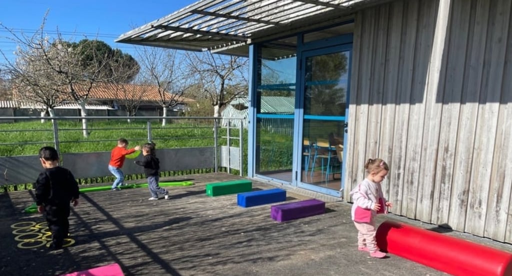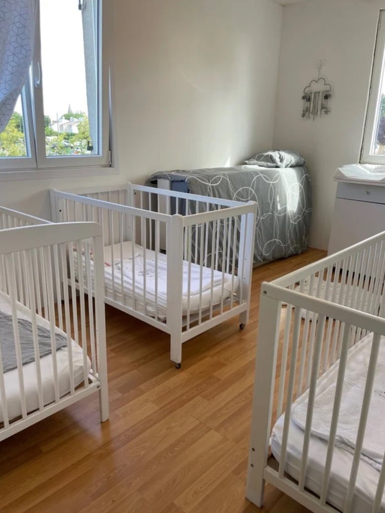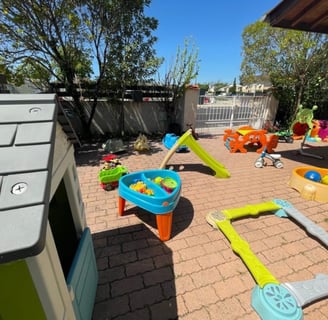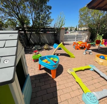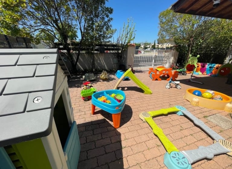La maison dispose d’un espace de jeux bien équipé, sans parc, mais avec de grands tapis, des modules de motricité, des comptines et des livres. Aux beaux jours, les enfants profitent d’un jardin sécurisé avec toboggan, draisiennes, maison SMOBY, et même un coin jardinage.