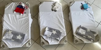 En bas, sur des couchettes Wesco au sol (même équipement qu’en structure type crèche) , afin de faciliter l’autonomie des